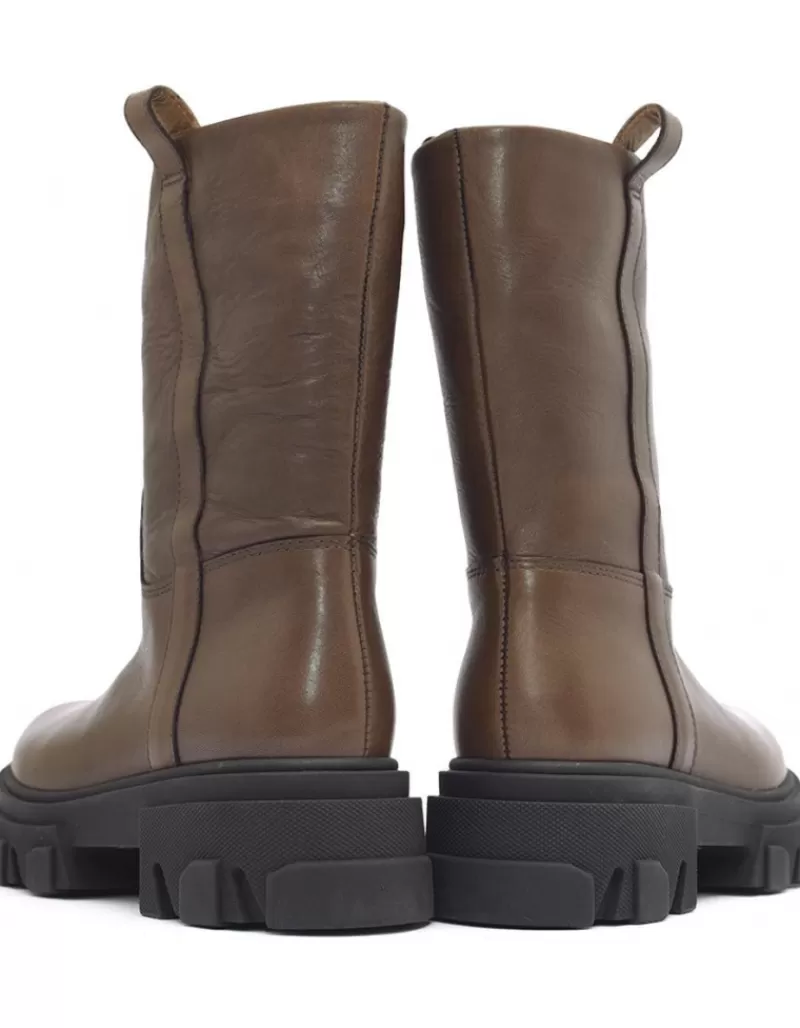 Bota Para Mujer Alpe Liverpool, Fabricada En Piel (Ball Lux) De Color Avellana Con Tacon De 5 Cm, Suela Antideslizante Y Puntera Redonda, Sin Cierre Y Cana Media.