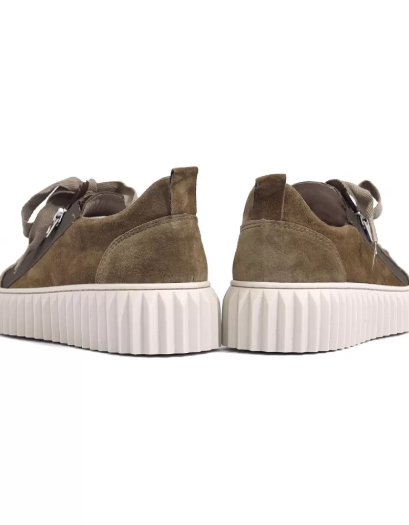Sneaker Casual Para Mujer Alpe Alba, Fabricado En Piel (Baby Silk) De Color Kaki Sin Tacon, Suela Antideslizante Y Puntera Redonda, Con Cierre Mediante Cordon.