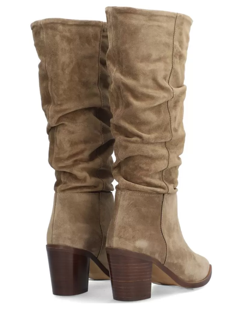 Boots Para Woman Alpe Alina, Fabricado En Piel (Baby Silk Gliter) De Color Sander Con Tacon De 6,5 Cm, Suela Antideslizante Y Puntera Afilada, Sin Cierre Y Cana Long.