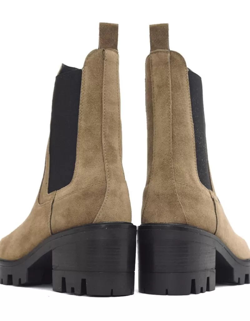 Botin Para Mujer Alpe Amelie, Fabricado En Piel (Baby Silk) De Color Kaki Con Tacon De 6 Cm, Suela Antideslizante Y Puntera Redonda, Sin Cierre Y Cana Media.