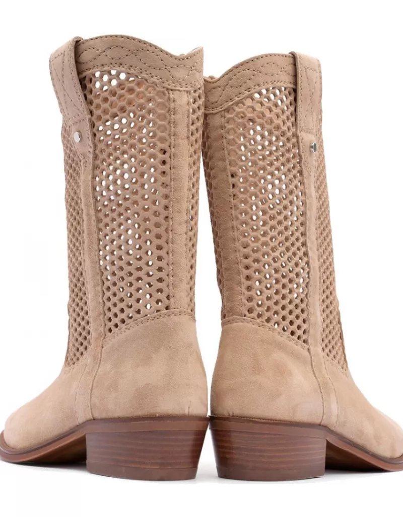 Bota Para Mujer Alpe Cecile, Fabricada En Piel (Baby Silk) De Color Arena Con Tacon De 3,5 Cm, Suela Antideslizante Y Puntera Afilada, Sin Cierre Y Cana Media.