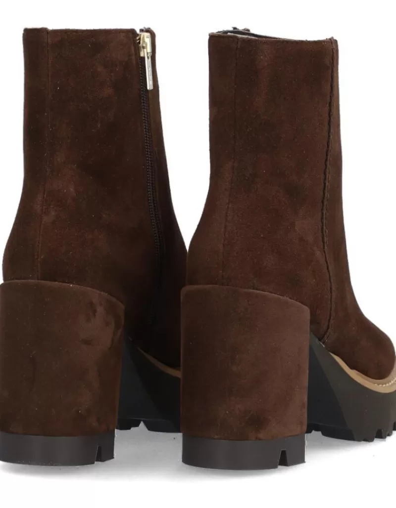 Ankle Boots Para Woman Alpe Colette, Fabricado En Piel (Baby Silk Gliter) De Color Arabica Con Tacon De 7 Cm, Suela Antideslizante Y Puntera Rounded, Con Cierre Mediante Cremallera Low.