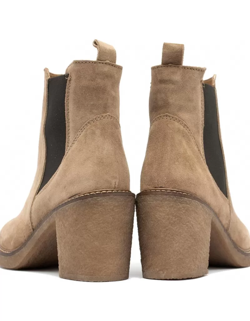 Botin Para Mujer Alpe Crep, Fabricado En Piel (Baby Silk) De Color Canela Con Tacon De 7,5 Cm, Suela Antideslizante Y Puntera Redonda, Sin Cierre Y Cana Baja.