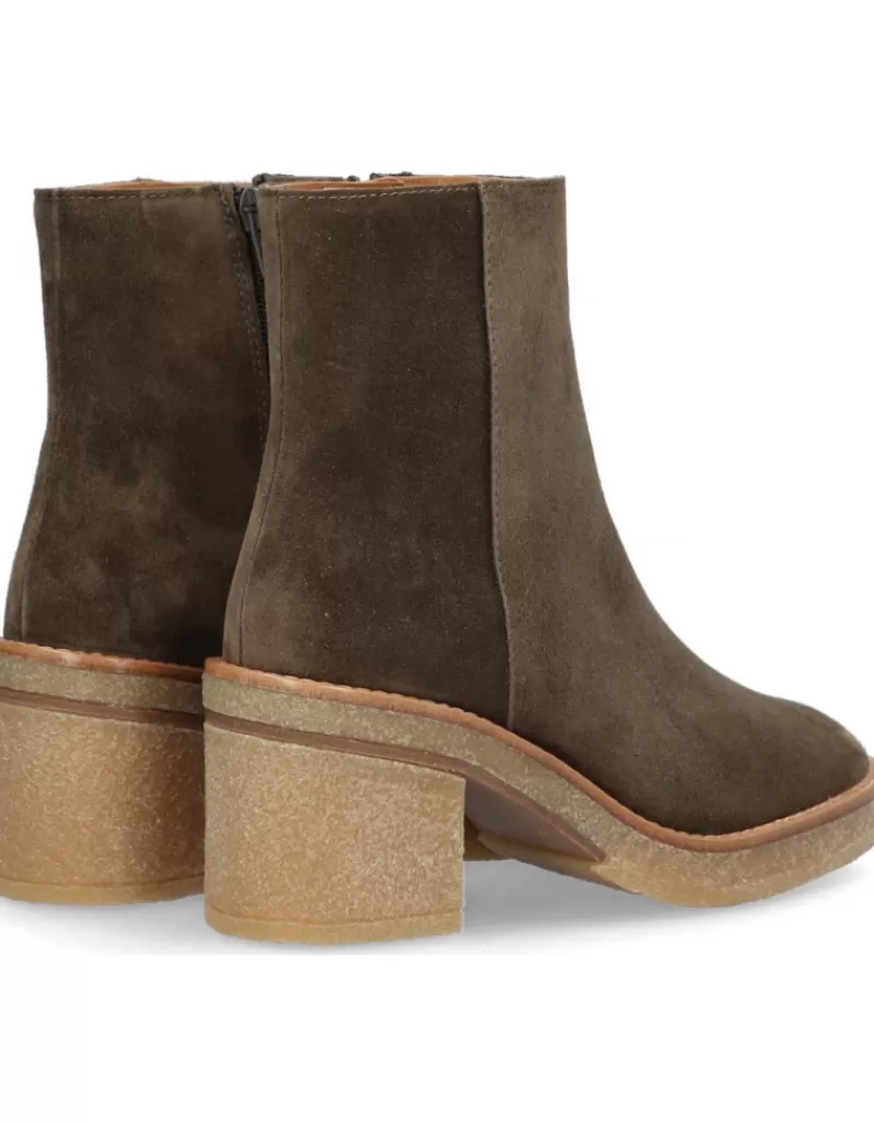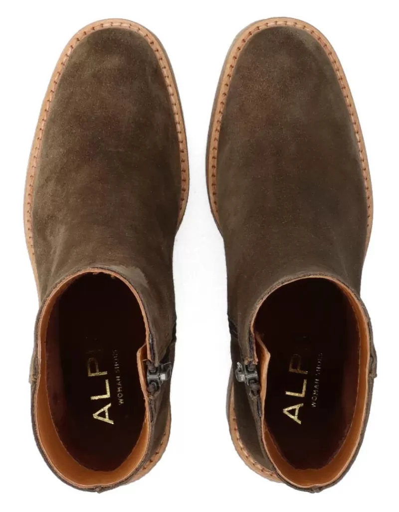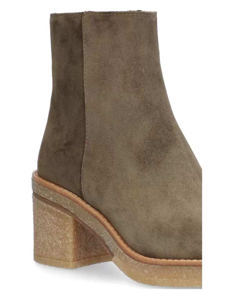 Ankle Boots Para Woman Alpe Janis, Fabricado En Piel (Baby Silk Gliter) De Color Olive Con Tacon De 7,5 Cm, Suela Antideslizante Y Puntera Rounded, Con Cierre Mediante Cremallera Y Cana Low.