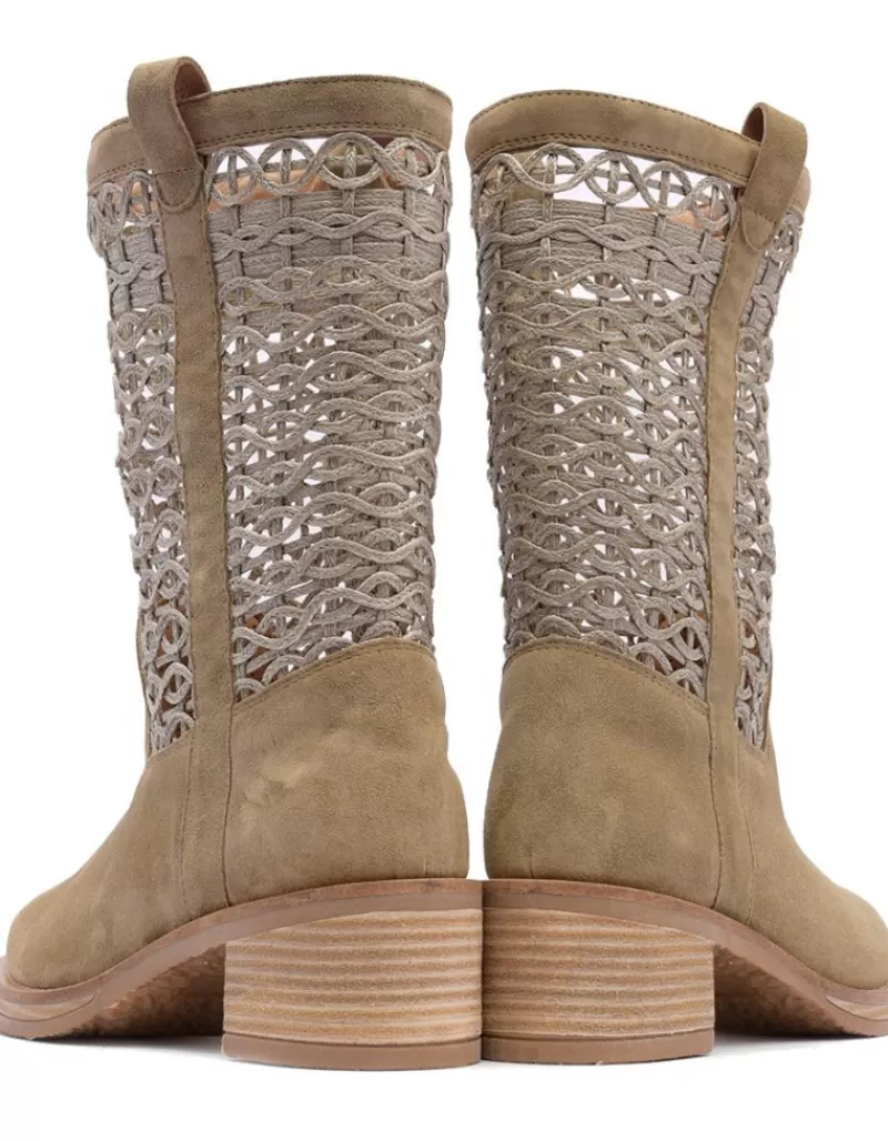 Bota Para Mujer Alpe Madame, Fabricada En Piel (Baby Silk) De Color Kaki Con Tacon De 5 Cm, Suela Antideslizante Y Puntera Redonda, Sin Cierre Y Cana Media.
