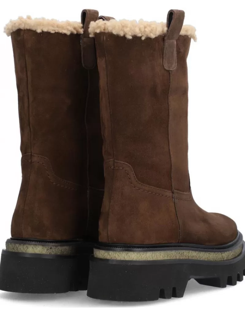 Boots Para Woman Alpe Milano, Fabricado En Piel (Baby Silk Gliter) De Color Arabica Con Tacon De 5 Cm, Suela Antideslizante Y Puntera Rounded, Sin Cierre Y Cana Medium.