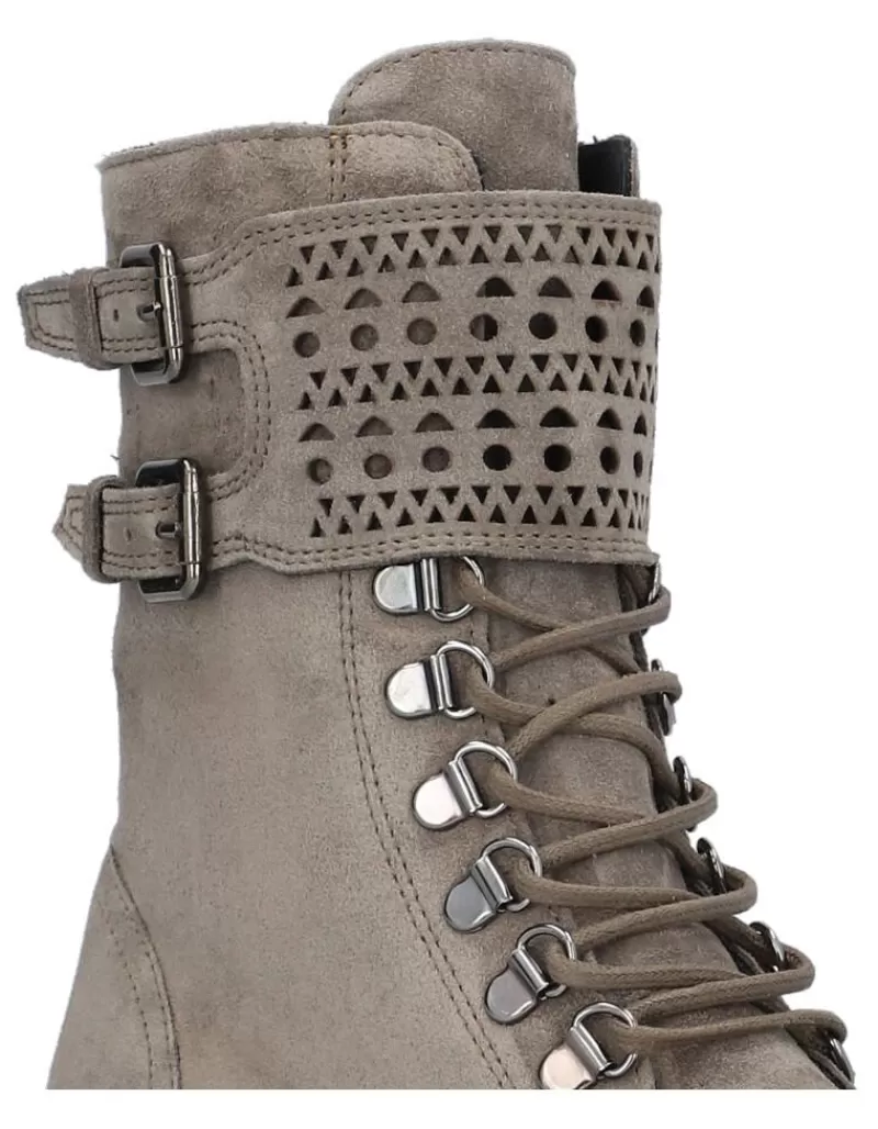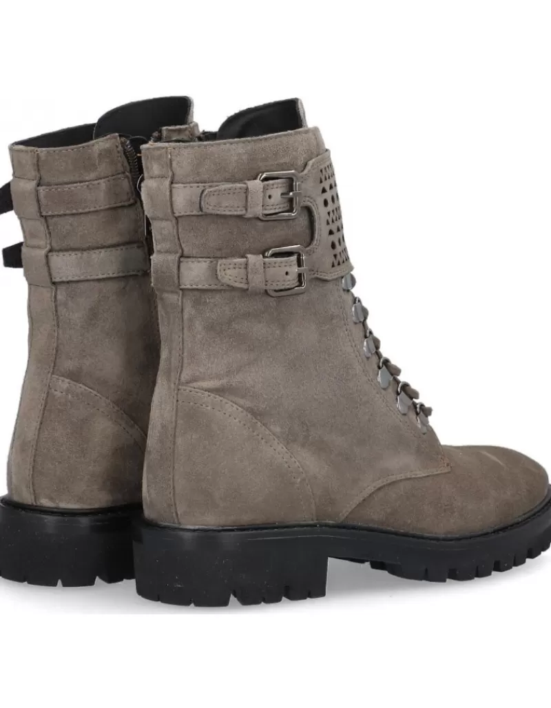 Boots Para Woman Alpe Militare, Fabricado En Piel (Baby Silk Gliter) De Color Taiga Con Tacon De 3,5 Cm, Suela Antideslizante Y Puntera Rounded, Con Cierre Mediante Hebilla Y Cana Medium.