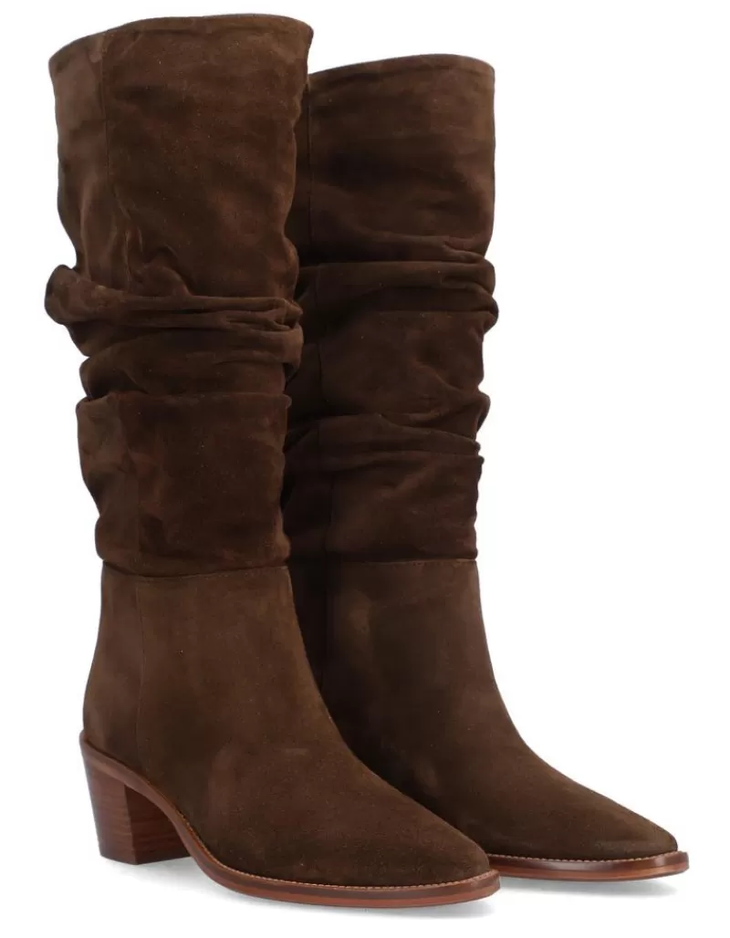 Bota Para Mujer Alpe Nevada, Fabricada En Piel (Baby Silk) De Color Arabica Con Tacon De 6 Cm, Suela Antideslizante Y Puntera Afilada, Sin Cierre Y Cana Alta.