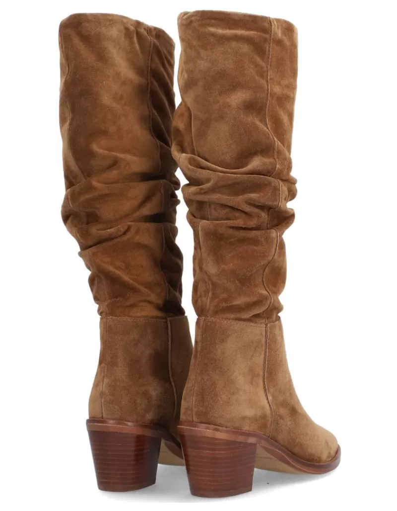 Bota Para Mujer Alpe Nevada, Fabricada En Piel (Baby Silk) De Color Cuero Con Tacon De 6 Cm, Suela Antideslizante Y Puntera Afilada, Sin Cierre Y Cana Alta.
