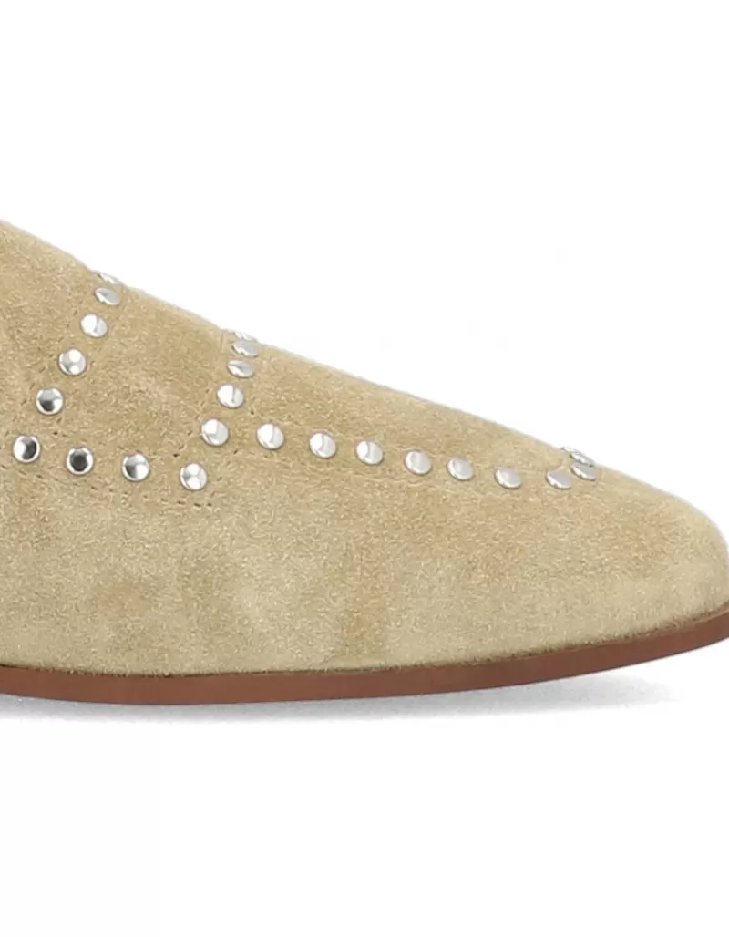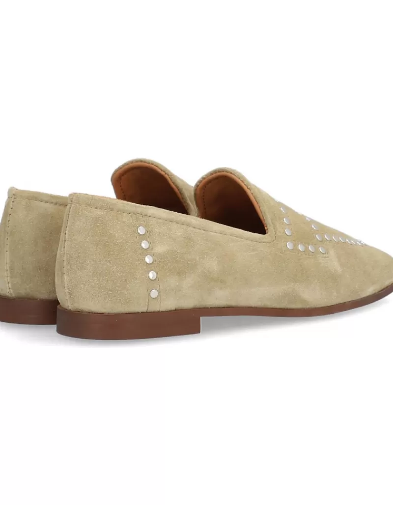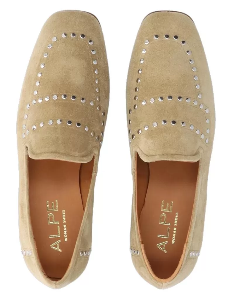 Moccasins Para Woman Alpe New Roma, Fabricado En Piel (Baby Silk Gliter) De Color Tabaco Con Tacon De 1 Cm, Suela Antideslizante Y Puntera Cuadrada, Sin Cierre.
