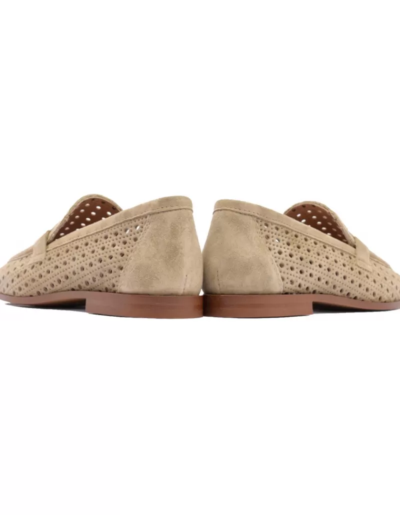 Moccasins Para Woman Alpe New Roma, Fabricado En Piel (Baby Silk Gliter) De Color Kaki Con Tacon De 1 Cm, Suela Antideslizante Y Puntera Cuadrada, Sin Cierre.