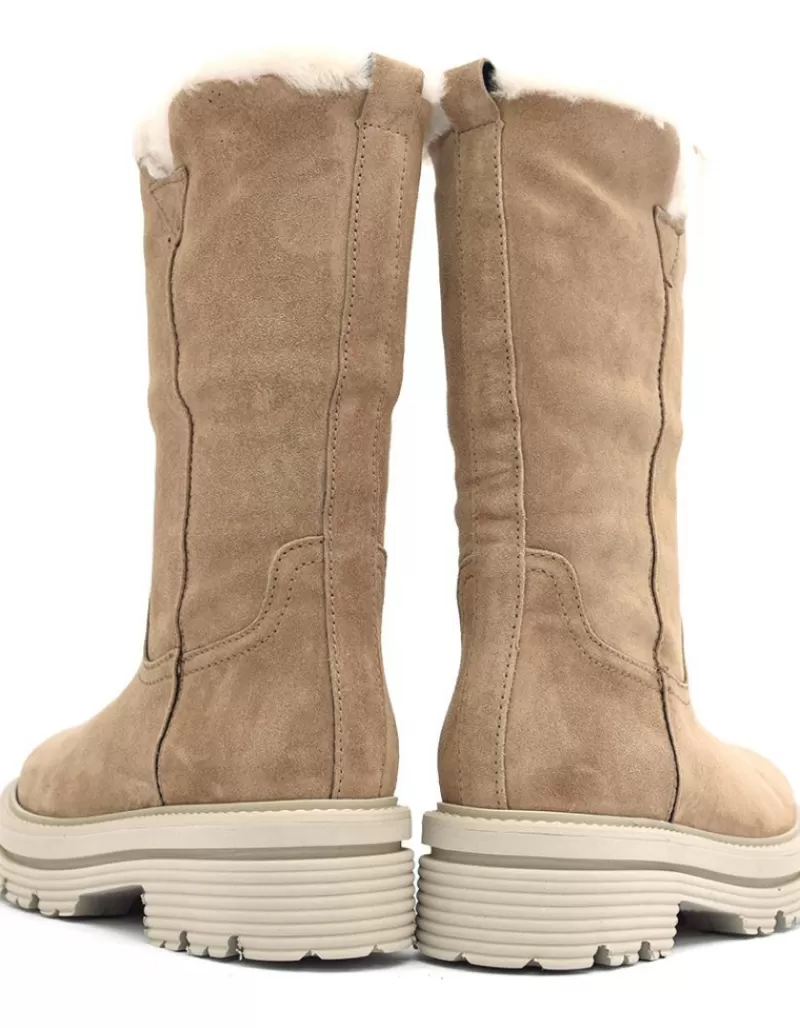 Bota Para Mujer Alpe Oslo, Fabricada En Piel (Baby Silk) De Color Canela Con Tacon De 4,5 Cm, Suela Antideslizante Y Puntera Redonda, Sin Cierre Y Cana Alta.
