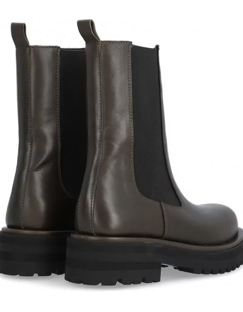 Bota Para Mujer Alpe Sienna, Fabricada En Piel (Becerro) De Color Olive Con Tacon De 5 Cm, Suela Antideslizante Y Puntera Redonda, Sin Cierre Y Cana Media.
